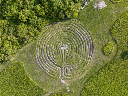 This breathtaking overhead view captures the serene shoreline of Mansion Beach on Block Island, Rhode Island, where golden sands seamlessly blend with vibrant turquoise waves. The intricate patterns carved by the tide create a mesmerizing natural artwork, showcasing the beach's pristine beauty and unique coastal landscape.
